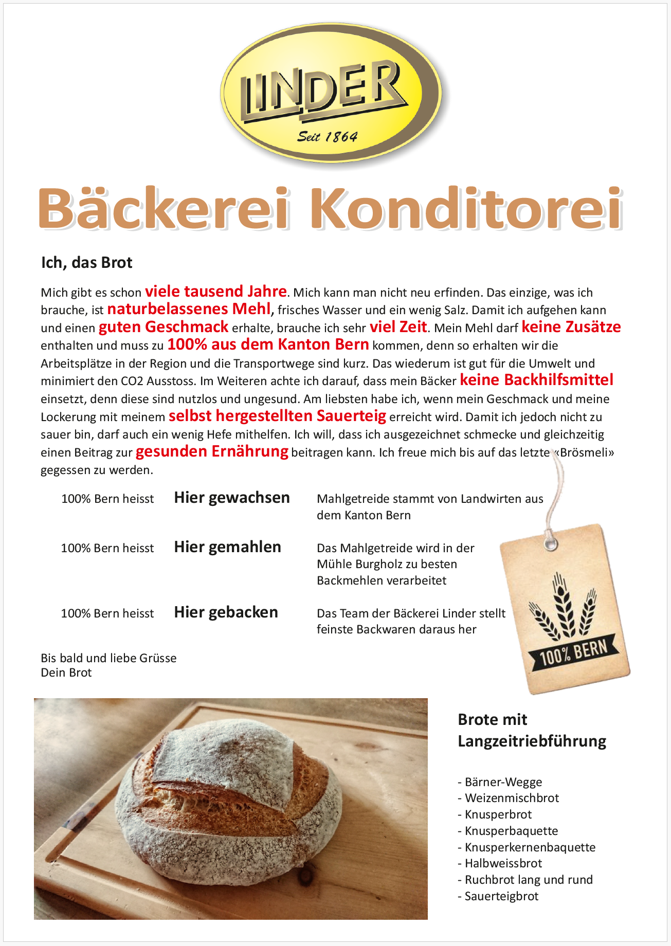Mein Mehl darf keine Zusätze enthalten und muss zu 100% aus dem Kanton Bern kommen, denn so erhalten wir die Arbeitsplätze in der Region und die Transportwege sind kurz. Das wiederum ist gut für die Umwelt und minimiert den CO2 Ausstoss.